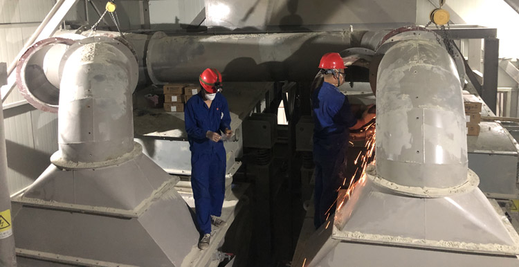 此次我司的安裝任務是某制砂廠φ1100、φ650除塵管道的彎、直管易磨損處安裝耐磨陶瓷和檢修平臺的搭建。由于海口市天氣炎熱,日平均氣溫均達40℃以上,停機時間短且在距離地面20多
